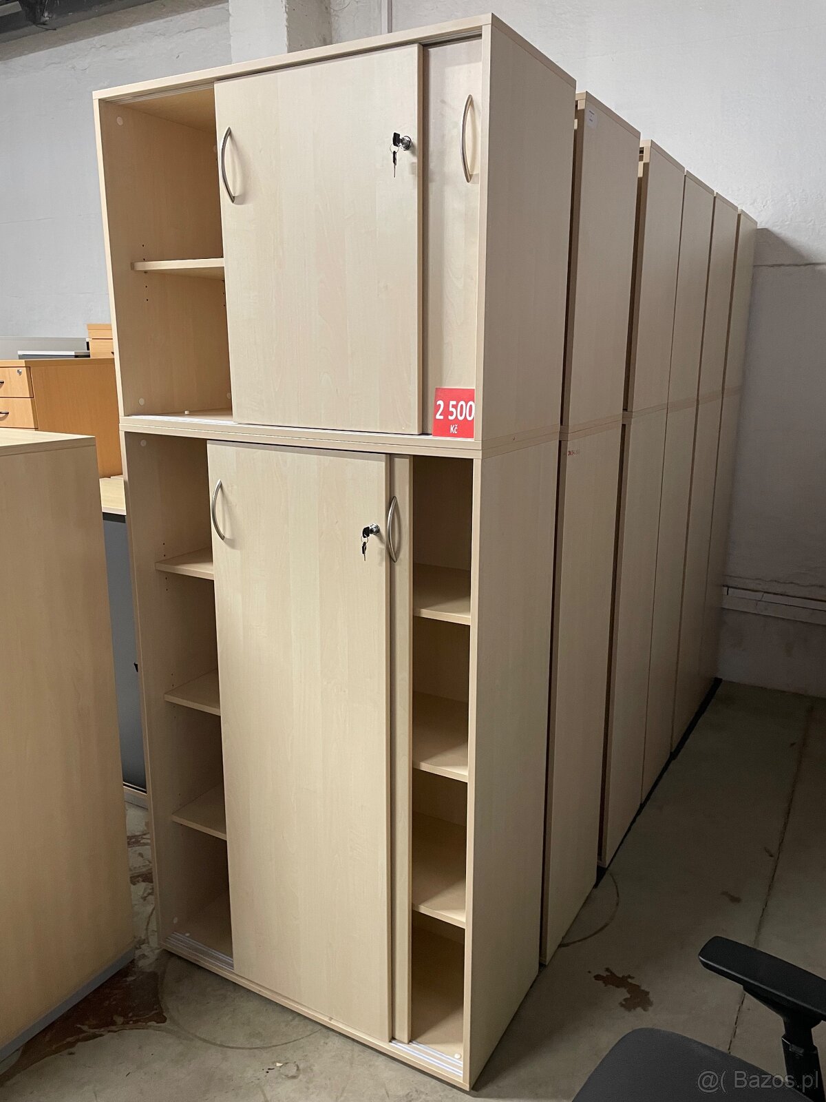 Sprzedam szafki Techo z przesuwanymi drzwiami, wysokiej jakości półkami i dekorem z jasnego drewna. Wymiary: szer. 100 cm, wys. 227 cm, wys. 43,5 cm. Szafki były używane, ale są w dobrym stanie. Możliwość sprzedaży osobno (góra lub dół).