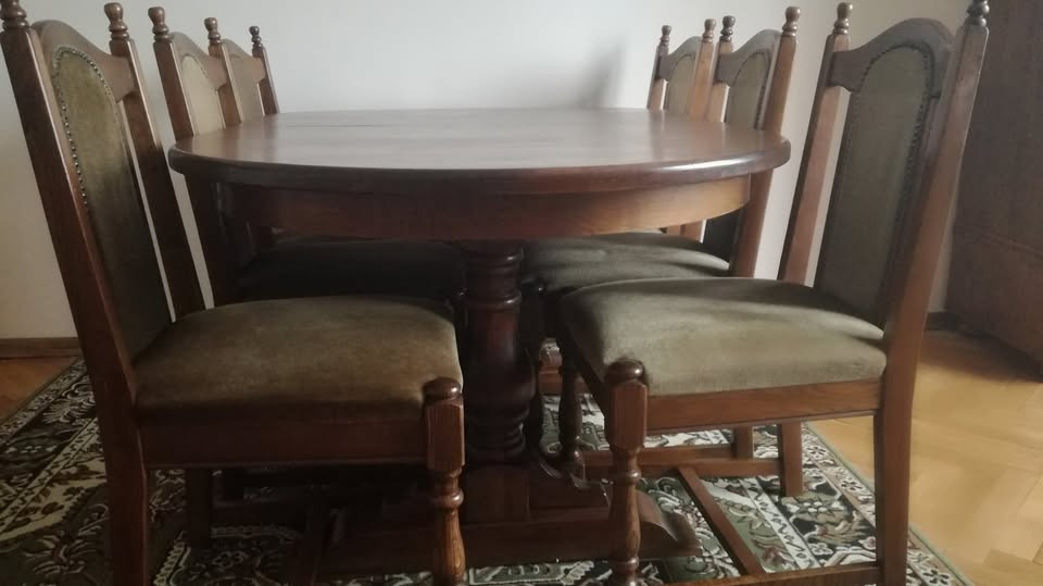 Stół ciężki, owalny, duży rozkładany (10-12 osób), i 6 krzeseł drewnianych, zielona tapicerka, meble używane w stanie ogólnie dobrym. Na stole jest rysa. Cena za komplet 3.000 zł