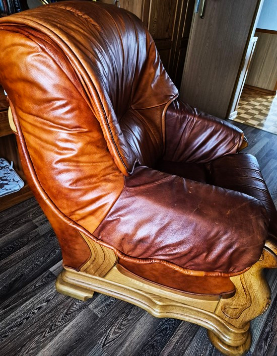 Kler Komplet wypoczynkowy 2+1 drewno,skóra prawdziwa
