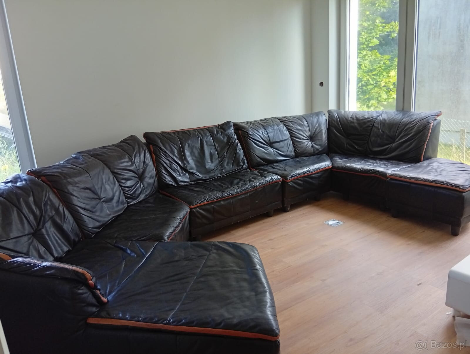 Mam do zaoferowania fajną klubową kanapę z czarnej skóry składającą się z sześciu elementów. Po remoncie nie pasuje nam do wystroju domu. Wymiary: 2m, na zdjęciu wzdłuż okna, wzdłuż ściany 2,40 m, prosty odcinek po lekkim przegięciu ma 2,10m, bok z podnóżkiem 160 cm, szerokość siedzisk 82 cm. Kanapa jest zadbana, drobne ślady wynikające z użytkowania. Na zdjęciach jest lekko zakurzona ponieważ chwilę przed zdjęciami było szlifowanie ścian w sąsiednim pokoju.