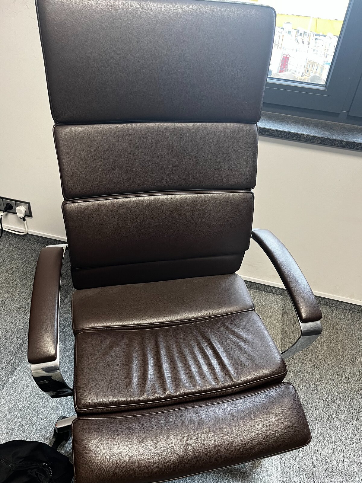 Elegancki fotel biurowy, obrotowy, siedzisko, podłokietniki i tył: miękka skóra. Szkielet ze stali w kolorze aluminium, lakierowany proszkowo, na kółkach do podłóg miękkich.