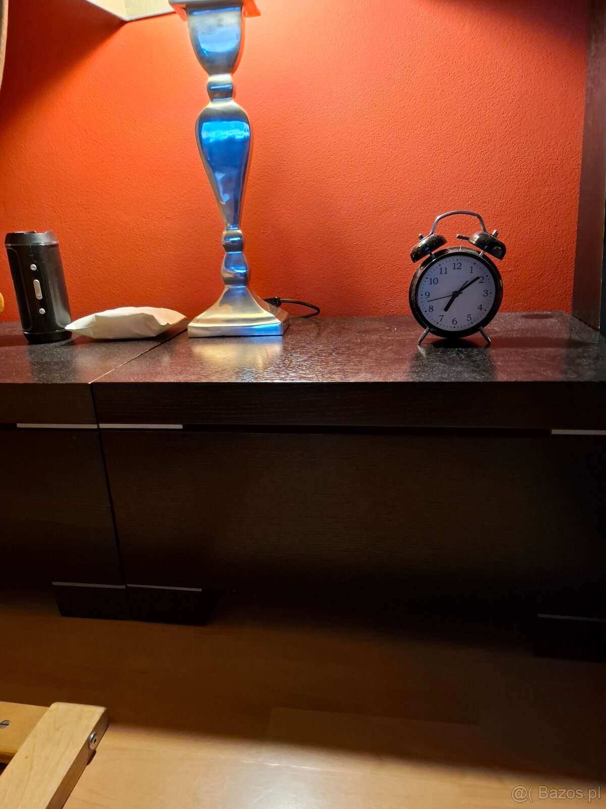 Komplet czarny składa się z podwójnego łóżka 220x180cm,wys wezgłowia 85cm,dwie komody z 3ma.szufladami100x50x75cm,dwa stoliki nocne 60x40x33cm oraz półka naścienna 120x20cm.Łóżko ma dwa stelaże z regulowaną sprężystością,natomiast 2 materace 200x80cm mogą być po uzgodnieniu ceny.Sypialnia w czarnej drewnianej okleinie,stan bardxo dobry,piękna.