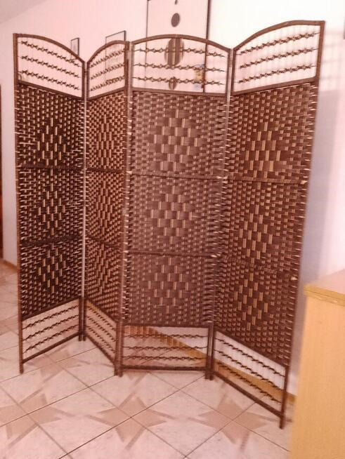 Parawan pokojowy kotara kolor ciemny brąz, (wysokość x szerokość x grubość skrzydła): 180 x 200 x 2 cm jeden element to 50cm, dwustronny, używany, bardzo szerokie możliwości wykorzystania , Parawan wykonany z taśmy wiklinowej (mieszanka wikliny i trawy morskiej) plecionej na drewnianym stelażu (drewno naturalne niemalowane). Parawan składa się z czterech części połączonych ze sobą zawiasami.