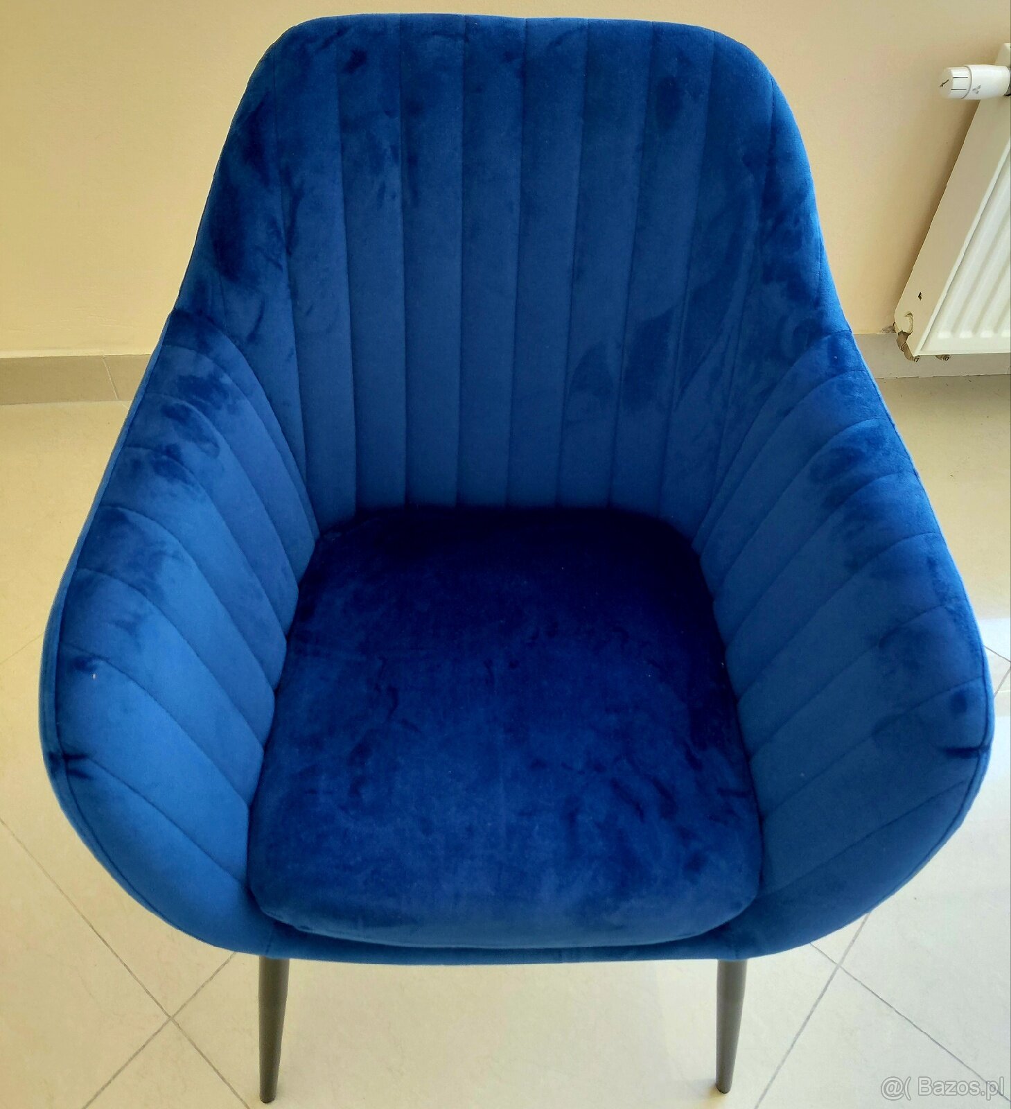 Wygodny, tapicerowany welurowy fotel w kolorze niebieskim. Elegancki i stylowy mebel, który doskonale sprawdzi się w salonie lub sypialni. Solidna konstrukcja i miękkie siedzisko zapewniają wysoki komfort użytkowania.