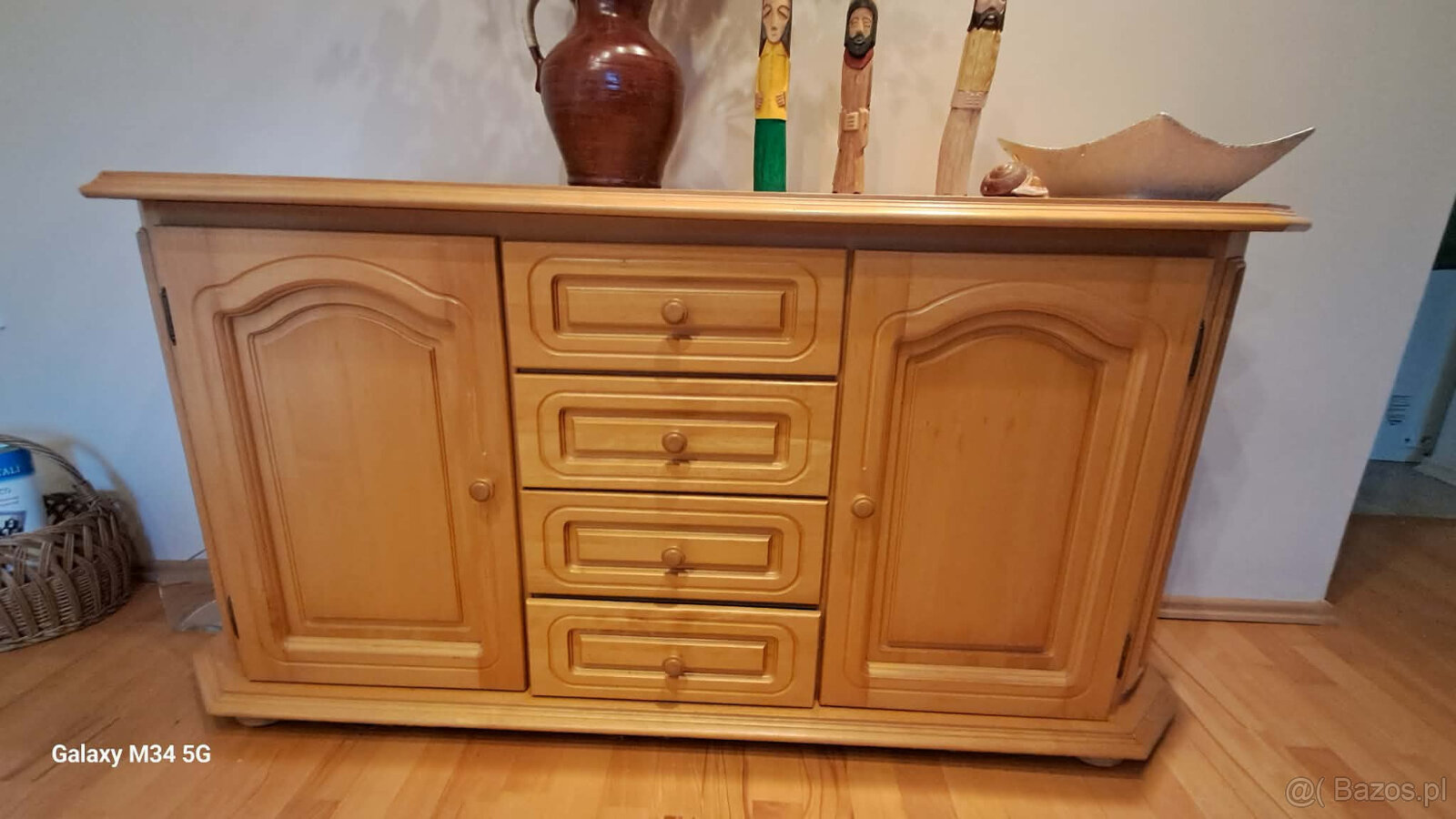 W skład zestawu wchodzi komoda, witryna, stolik pod telewizor. Stan dobry. Meble solidne, bukowe, zadbane. Można przemalować i zrobić własną aranżacje.W przypadku zainteresowania mogę przesłać więcej zdjęć.