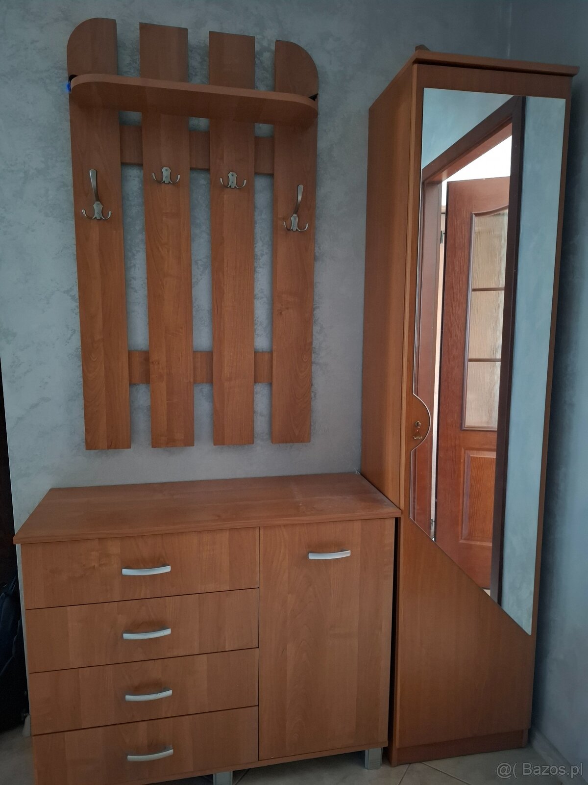 Komoda z czterema szufladami i szafką na buty, wieszak z półką na czapki, chłopek z półkami w sr0dku oraz z lustrem na drzwiach.